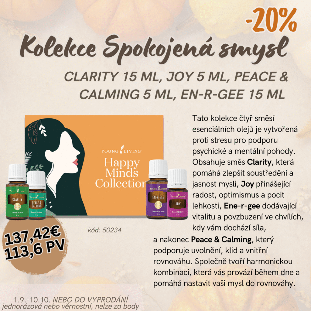 Toto jsou dvě kolekce, které zde máme pouze do 10.10. jako i celý podzimní katalog nebo do vyprodání zásob a za mě ti rozhodně nesmí uniknout. Jelikož s podzimem je naše nálada jako na houpačce, energie dochází. Kolekce Meditace nabízí zklidnění, které právě hledáš, pomůže s podzimními depresemi, ale i stresem. Kolekce Spokojená mysl ti pomůže se stresem, ale i ti dodá energii, radost i v šedé dny a pomůže ti se soustředit v práci, i když je už odpoledne tma a ty by jsi raději zalezla do postele.