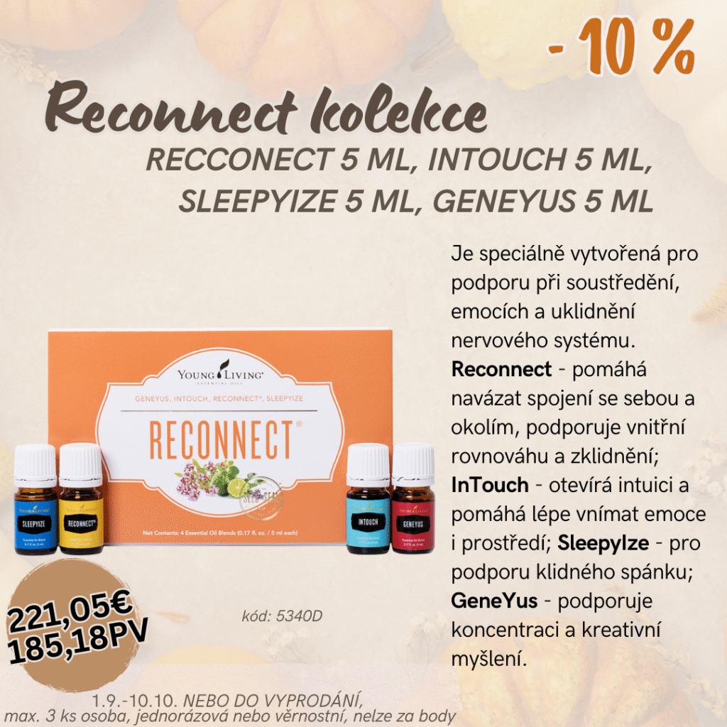 Kolekce Reconnect je sestavená ze čtyř prémiových esenciálních směsí, které obsahují ty nejkvalitnější, často i vzácné oleje — jako posvátné kadidlo, santal, růže a další. Tyto oleje nejsou jen krásné vůně, ale mají konkrétní, ověřené účinky na tělo i mysl. Dokážou: