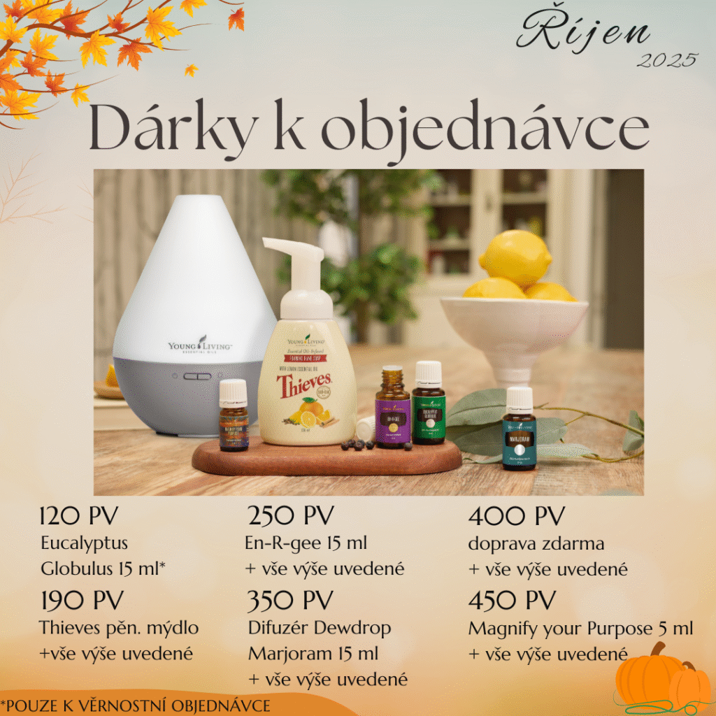 I dárky k objednávkám máme zaměřené na podzimní období, jelikož hned ke 120 PV dostaneš olej Eucalyptus Globulus 15 ml, který je skvělý právě při nachlazení a chřipce. Jen nezapomeň, že Eucalyptus Globulus je dárkem pouze v programu Věrnostní odměny. Vše o věrnostním programu si přečti ZDE.