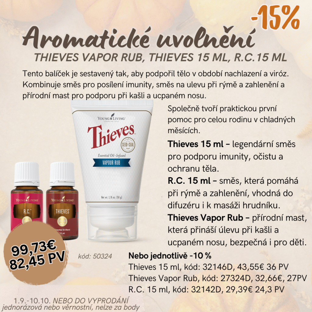 Balíček Thieves RC a Thieves Vapor Rub je ideální pomocník pro podzimní období, kdy tě trápí nachlazení a ucpané dýchací cesty. Thieves RC kombinuje sílu eukalyptu, máty peprné, rozmarýnu a známé Thieves směsi, která pomáhá uvolnit dýchání a podpořit dýchací cesty. Thieves Vapor Rub je přírodní balzám s těmito oleji, který přináší úlevu při ucpaném nose a kašli, stačí ho natřít na hrudník nebo záda a cítit okamžitou úlevu. Tento balíček ti pomůže dýchat lépe, cítit se volněji a podpořit obranyschopnost v náročném období.