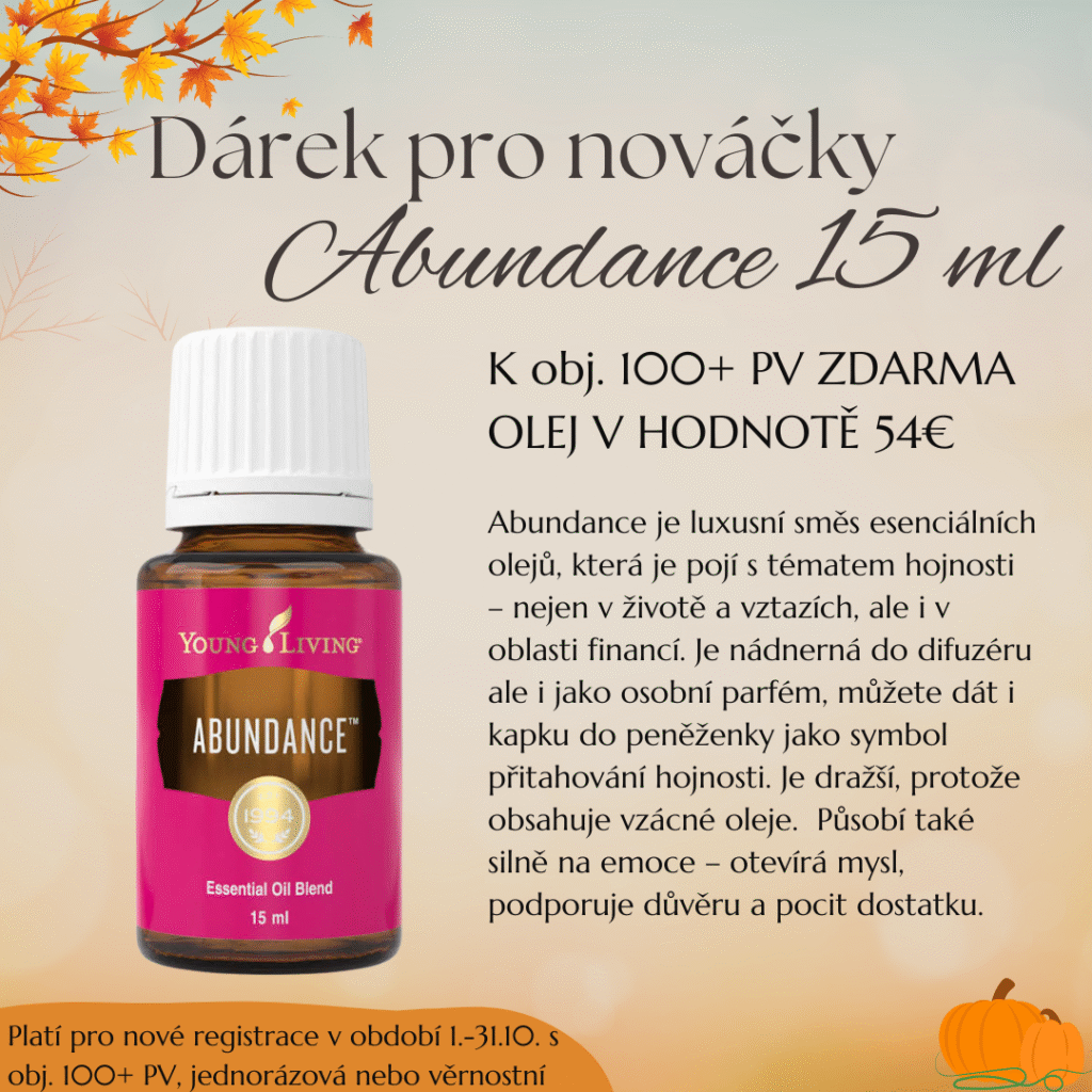 Každý nováček, který objedná alespoň za 100 PV dostane jako dárek olej Abundance 15 ml, který stojí ve velkoobchodní ceně 1350 Kč a neznám nikoho, kdo by ho nemiloval.