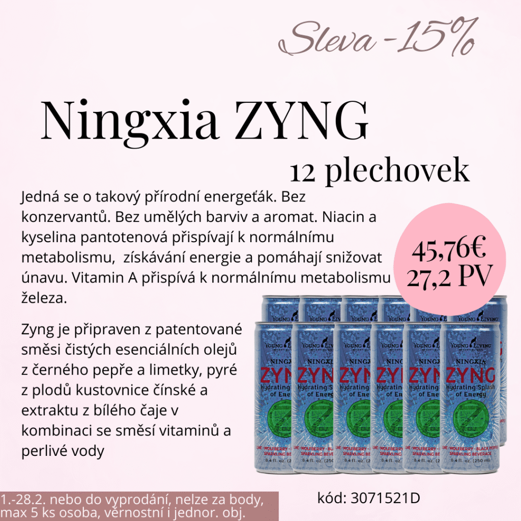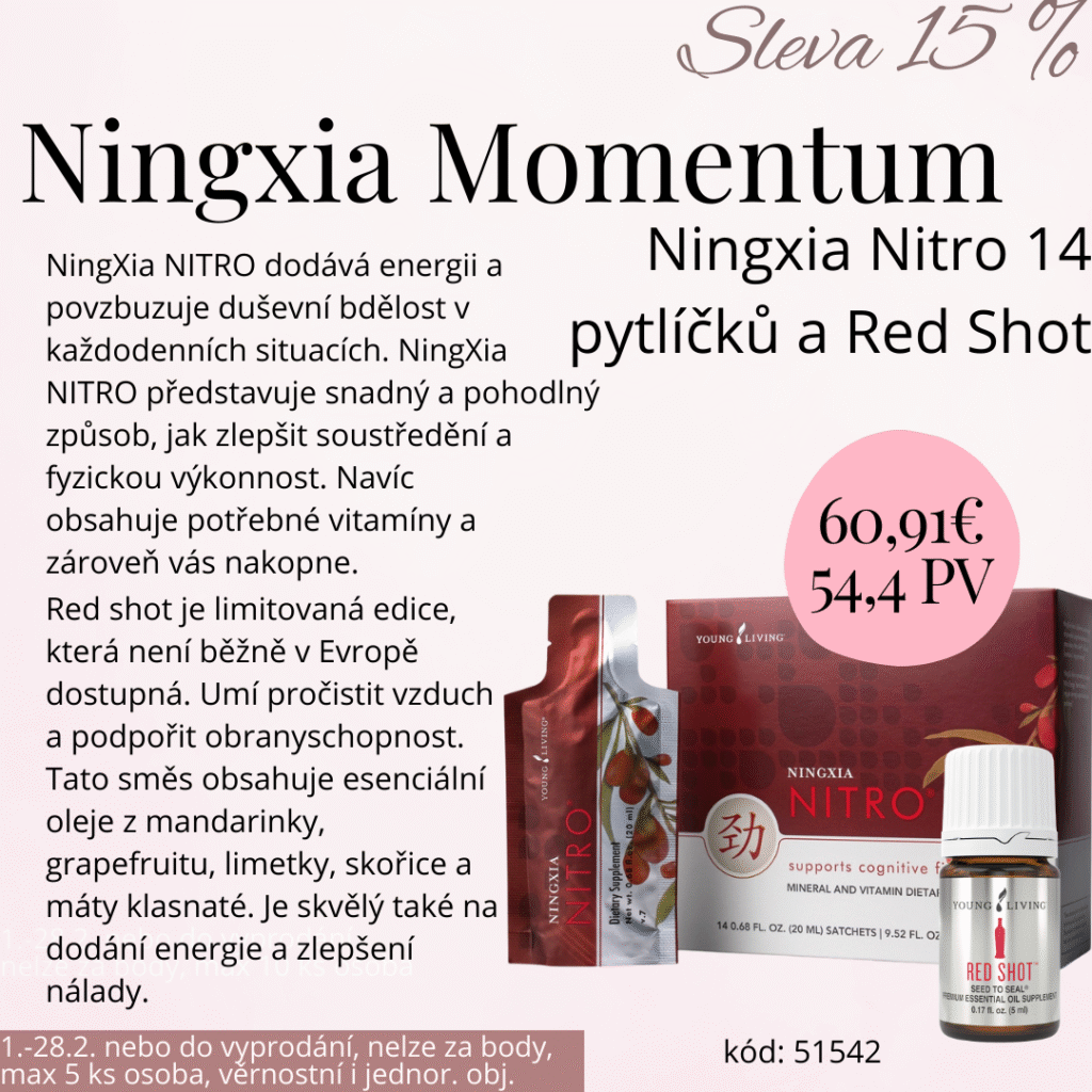 Minulý měsíc jsme měli v akci nápoj Ningxia a možná jsi ho vyzkoušela poprvé, ale Ningxia není jen o tomto nápoji, v řadě Ningxia je i nápoj Zyng, který je takovým přírodním energerickým nápojem bez chemie nebo třeba Nitro, které je takovým rychlým nakopávačem. Pokud tedy trpíš často únavou, tato kombinace bude pro tebe správným řešením, a ještě podpoříš zdraví a imunitu. A my máme v únoru v akci tyto dvě věci, k Nitru navíc dostaneš jako dárek olej Red Shot z USA, který je skvělý na podporu imunity.