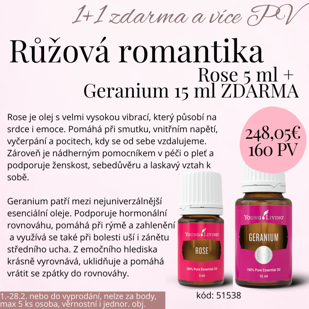 Prvním je Růžová romantika, kde nejen že dostaneš k oleji růže olej geranium, ale balíček je i za více PV. Co to znamená? Rychleji dosáhneš na dárky k objednávkám a přes věrnostní odměny se ti vrátí více % zpět. Olej růže je opravdový poklad na emoce a sebelásku a Germanium pomůže nejen se stresem, ale i s hormony či záněty uší.