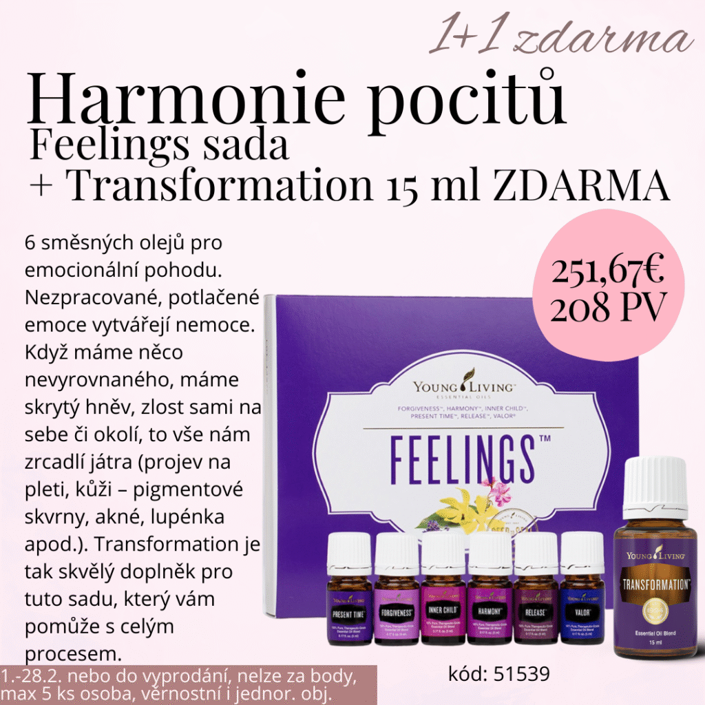 Ale máme tu zde i něco, na co všichni čekali dlouho – akci na sadu Feelings. Sada Feelings je sada olejů, které můžeš využít do difuzéru, ale i je k ní speciální rituál, který člověku pomůže zpracovat veškeré emoce. Oleje v této sadě vycházejí zvýhodněně a nyní ještě s dárkem navíc olej Transformation zdarma. Vše o Feelings sadě včetně zkušeností si přečti v naší skupině Feelings Challenge.