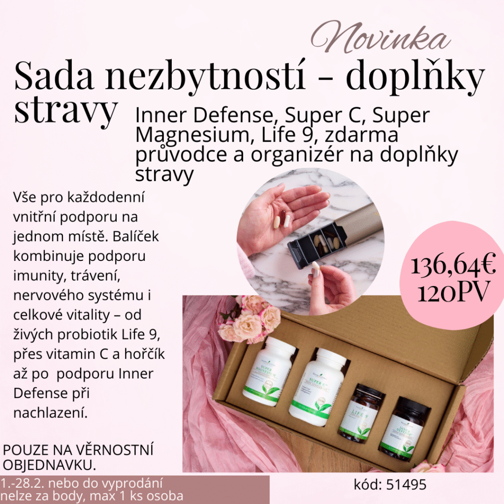 Druhou novinkou je sada doplňků stravy s dárkem navíc. V balíčku najdeš probiotika Life9, Super Magnesium, které ti pomůže na energii přes den a dobrý spánek v noci. Super C na podporu imunity a celkového zdraví a Inner Defense, který ti pomůže zahnat každou nemoc.